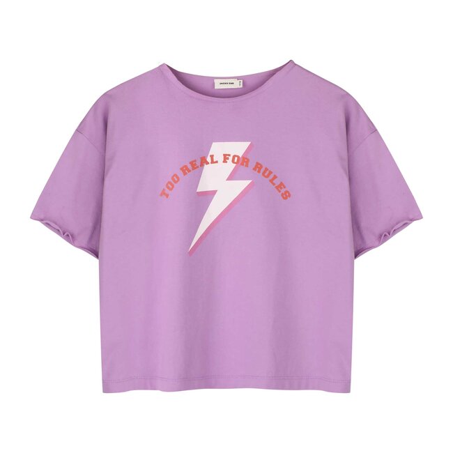 Too real for rules! ⚡ The Real Tee is made for little trendsetters who love a bold statement. This tee comes in the prettiest lilac shade and features a fun “Too Real For Rules” graphic with a lightning bolt on the front. The neckline has a slightly raw, unfinished look, giving it that cool laid-back vibe.